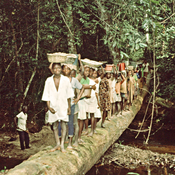 Hommes et femmes marchent ainsi durant des heures, traversant la forêt dense, empruntant de petits sentiers sinueux ainsi que de multiples passages périlleux tels que des troncs d’arbres, en guise de ponts, placés en travers des rivières. Dans la plupart des villages de brousse, la vente des légumes et des fruits cultivés est quasiment la seule source de revenu.